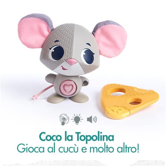 Gioco educativo interattivo studiato per aiutare lo sviluppo motorio, cognitivo ed emotivo dei bambini di 1 anno di età Giocattolo adatto alle manine e alle abilità motorie dei bimbi di 1 anno con reazioni causa-effetto di facile compresione Dai a Coco il suo formaggino e sentila sgranocchiare, nascondi la topolina sotto una coperta per farla fischiettare o mettila a nanna per farla russare in modo buffo Gioca al cucù e copri la piccola Coco: la sentirai fischiare e ti chiamerà; scoprila: applaudirà ed esulterà Incoraggia il gioco condiviso e il legame genitore-bambino: il genitore può raccontare storie con il personaggio come protagonista