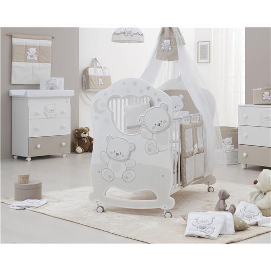 Caratteristiche Lettino con Doppie sponde mobili, bloccabili e con protezioni anti morso Il lettino dispone inoltre di un capiente cassetto a 2 scomparti Bagnetto 3 Cassetti con vaschetta interna e materassino fasciatoio Per facilitare la movimentazione, ogni lettino e bagnetto ha 4 ruote piroettanti di cui due con freno Completo tessile con colori e ricamo a tema.