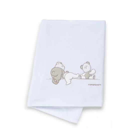La copertina per lettino in pile Giocoso di Foppapedretti è ricamata con i motivi di simpatici orsetti giocherelloni, nelle tinte del beige.