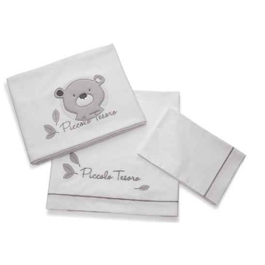 3 pezzi: paracolpi, piumone sfoderabile e federa cuscino. 100% cotone. Disponibile nei colori: grigio