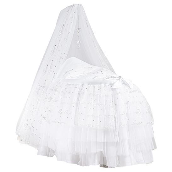 Una culla bianca completa di una ricca decorazione in tule ricamato, completa di materasso.