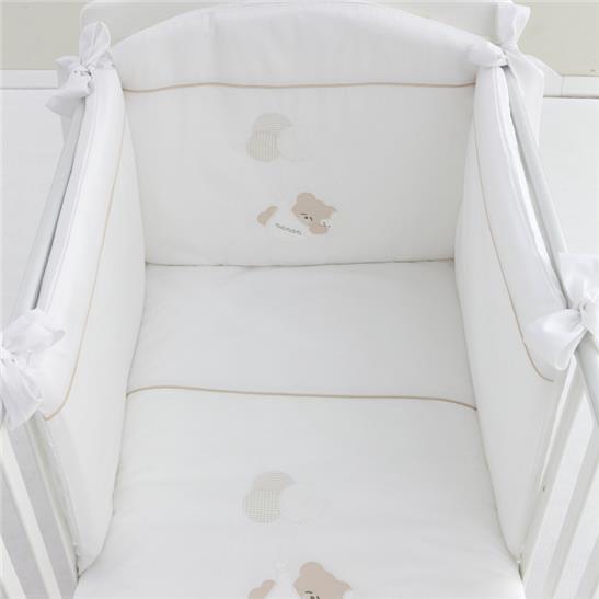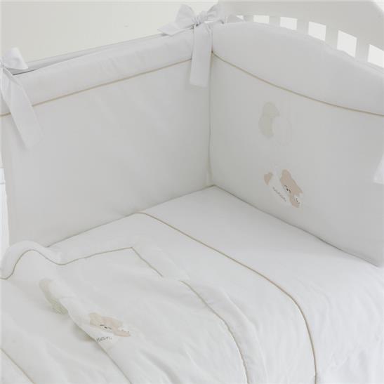 Il set piumone bianco Nanàn della nuova collezione Palloncino è composto da: federa per cuscino, paracolpi imbottito, piumone sfoderabile.