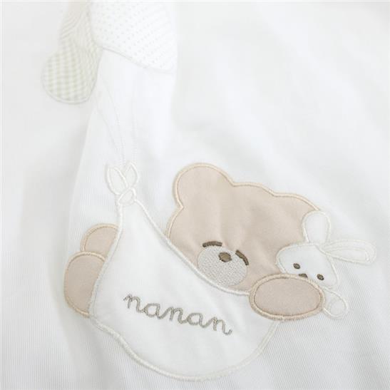 Facile al lavaggio, con una composizione di puro cotone chambre ed impreziosito da dolce orsetto ricamato all'interno di una tenera sacca sospesa da 3 adorabili palloncini.