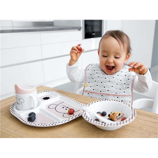 La ciotola e la tazza con due manici e il tappo antigoccia aggiuntivo sono disponibili anche separatamente. Piatti, taglieri per la colazione e utensili (cucchiaio e forchetta) coordinati possono essere acquistati anche singolarmente.