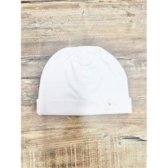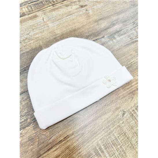 Questo cappellino in morbido jersey di cotone è l'accessorio fondamentale per i primi giorni di vita della tua neonata. Progettato per proteggere con estrema delicatezza la testina dai cambi di temperatura, unisce la funzionalità di un capo nascita alla bellezza di un prezioso fiore ricamato interamente a mano.