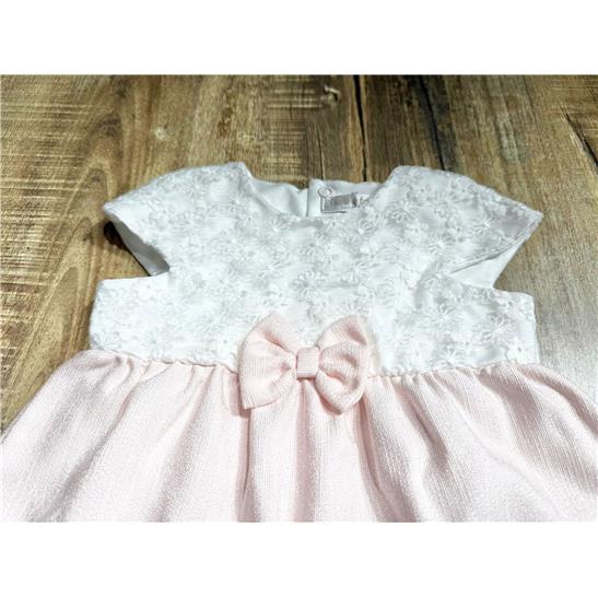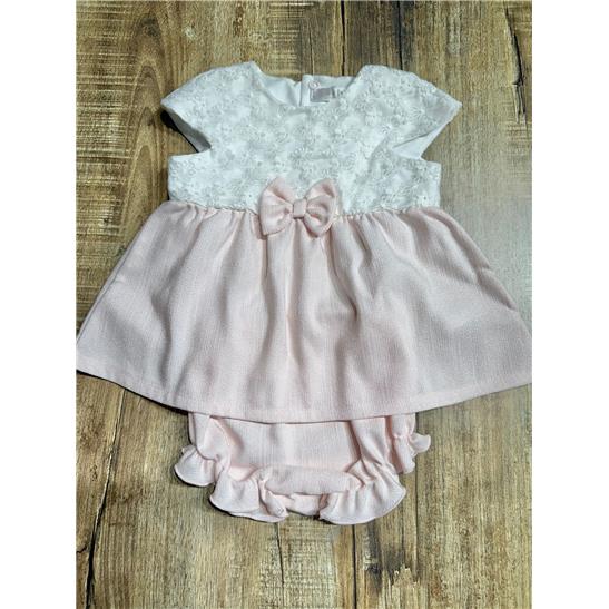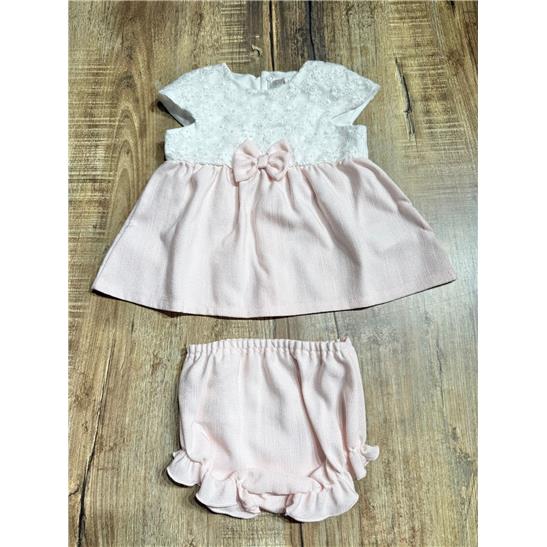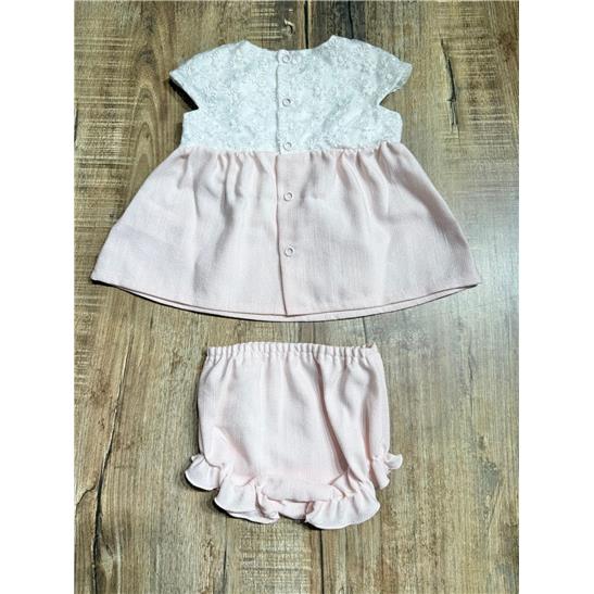 La parte superiore è impreziosita da delicati dettagli in pizzo e da un elegante fiocco centrale, mentre la gonna in tonalità rosa dona un tocco dolce e raffinato. Il copripannolino, con bordo arricciato, completa il look con armonia e cura dei dettagli.