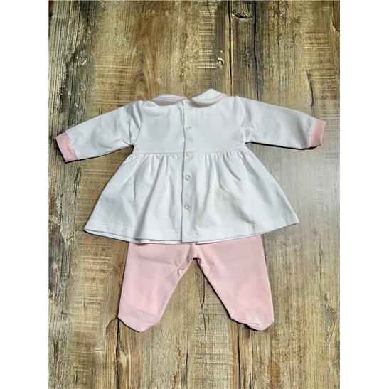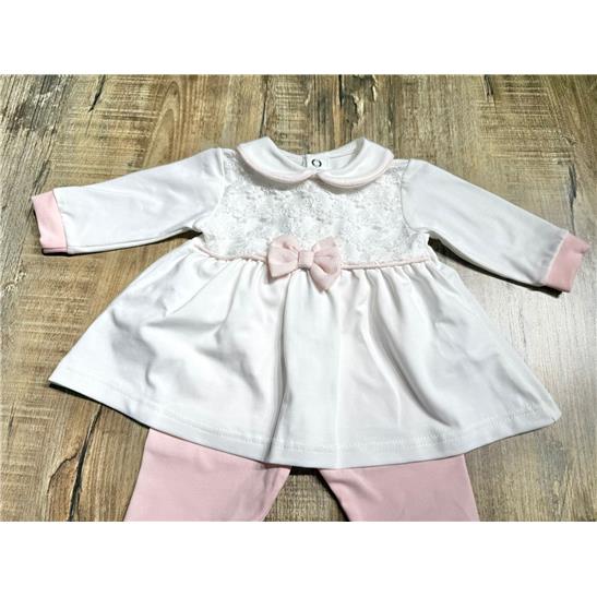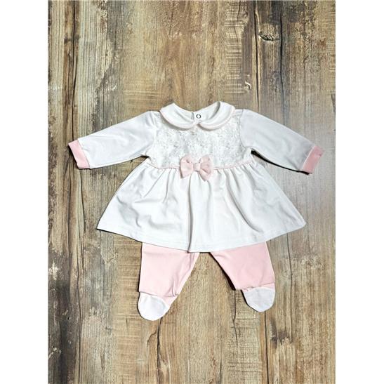 La parte superiore è impreziosita da un raffinato inserto in pizzo e da un elegante fiocco centrale in tonalità rosa, mentre il colletto tondo dona al capo uno stile classico e senza tempo. La ghettina con piedini coordinata completa il completo, assicurando praticità e massimo comfort.